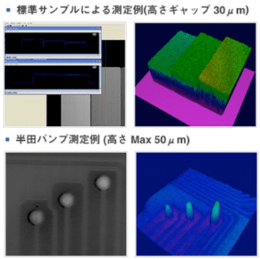 これまで非接触3D測定技術である、光干渉、共焦点法、三角測量(ステレオ法、光切断法など)の手法ではできなかった検査を、新開発の超高速CMOSセンサと弊社独自の画像処理により、検査時間のかかる全数検査の高精度な検査を実現いたします。